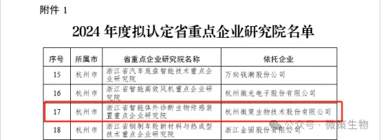 近日,浙江省经济和信息化厅公布了 2024 年度认定省重点企业研究院名单,引起了业界的广泛关注。杭州市共有34家企业上榜,其中,我司w66给利老牌生物“智能体外诊断生物传感装置省级企业研究院”位列其中,这是公司继国家“专精特新”小巨人企业之后的又一荣誉。